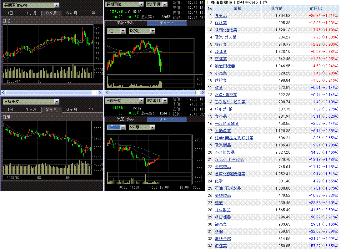 寄り直後は上昇しましたが、金融安定化策成立の不透明感からその後はじりじりと売られ後場に入ると一段安となりました。週末を控え買いも入りにくかったようです。業種別では、海運、鉄鋼、商社など景気敏感株が弱かったです。東証一部出来高は18億株、売買代金は2兆円と商いも盛り上がりませんでした。
