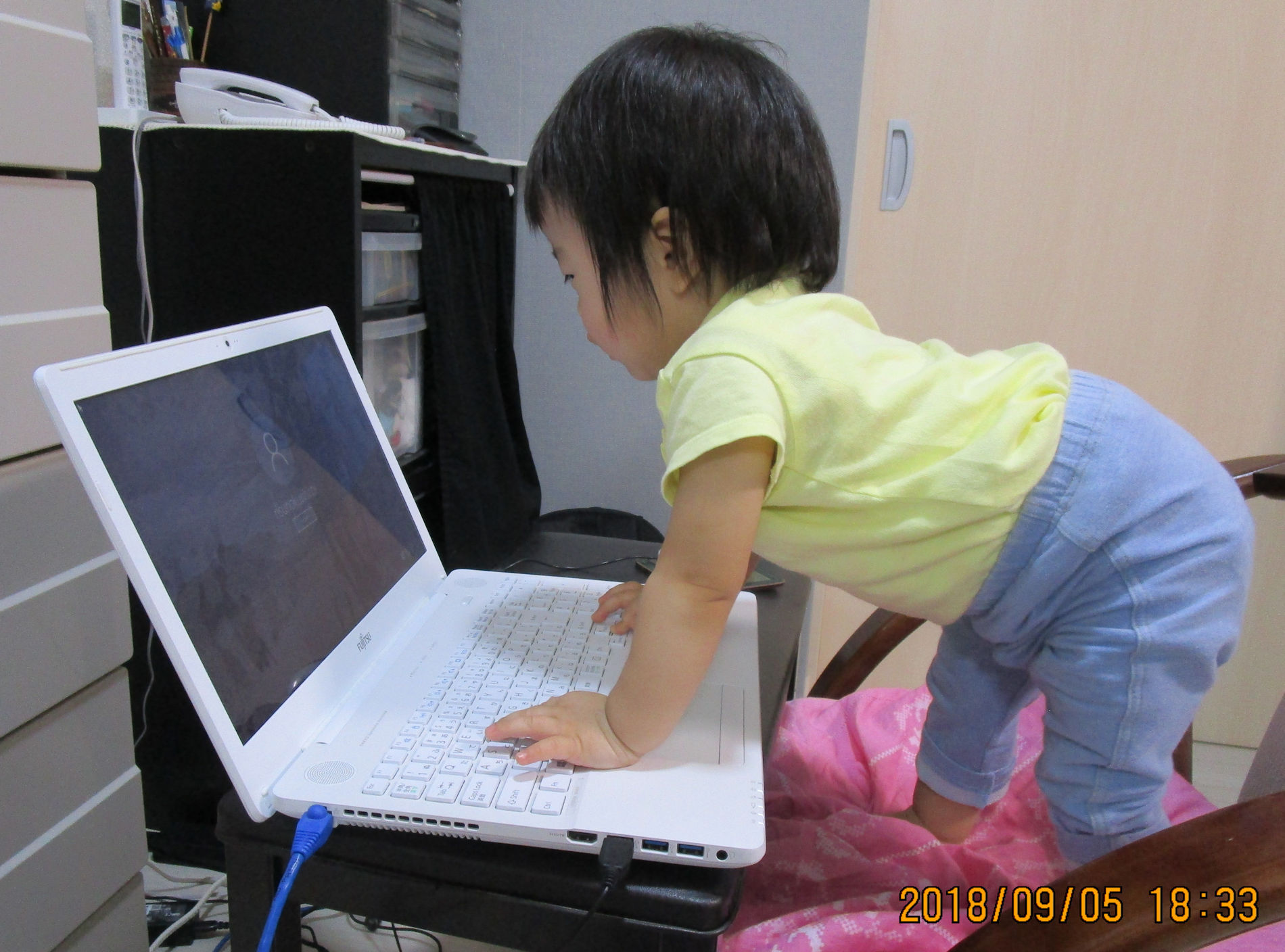 最新のパソコン、電源入れてお孫さんに、自由に使わせる、