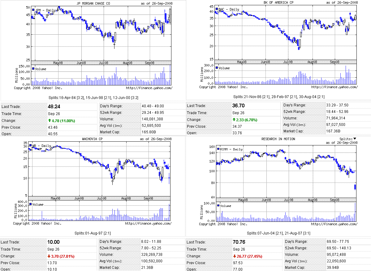 金融安定化策合意への期待感から上昇。JPモルガン、バンカメの上げ幅が大きかったため、ダウの上昇率が高かったです。リサーチ・イン・モーションが大幅安となったことからナスダック指数は軟調でした。