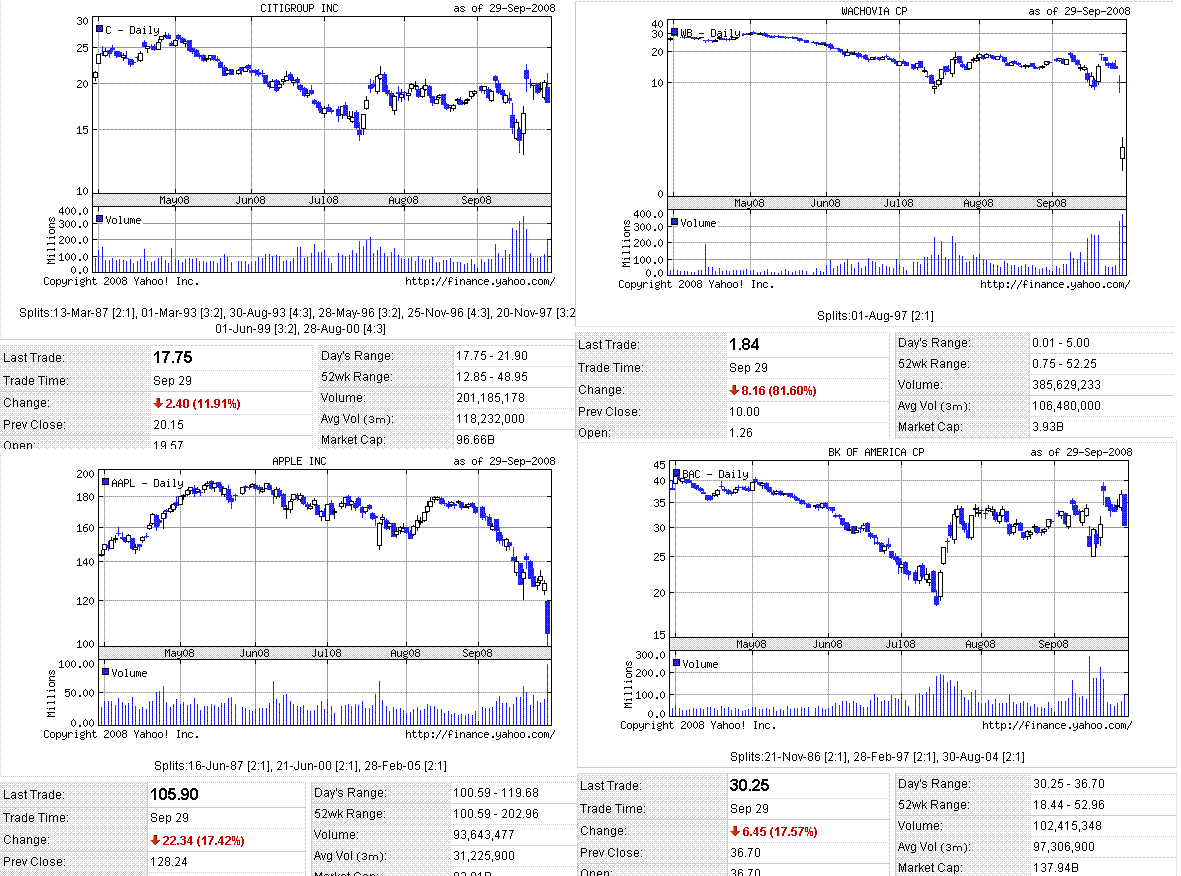 今後の展開は、金融安定化法案は修正を加えて再可決を目指すことが有力視されています。ユダヤ教の祝日で10/1までは議会はお休みなので、最短でも10/2みたいですね。とりあえず、今夜、日本時間で21:45からブッシュ大統領が何か話すみたいです。