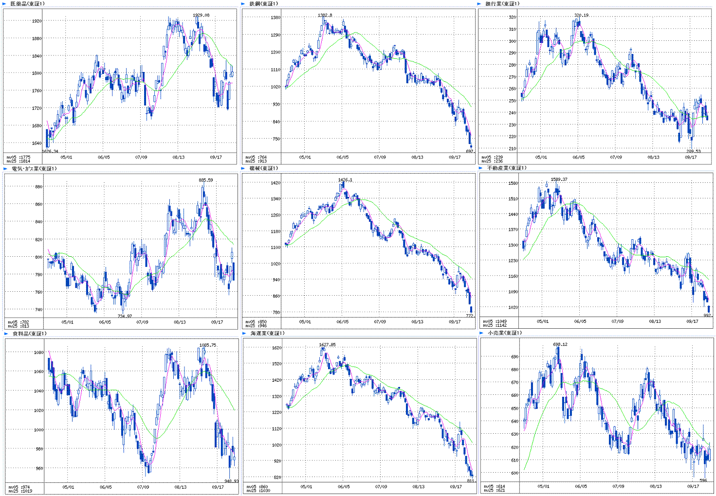 景気敏感株の下げっぷりが相変わらず凄いです。ディフェンシブも個別では強い動きのもあるけど、業種別指数で見るとそれほど上がっていない。
