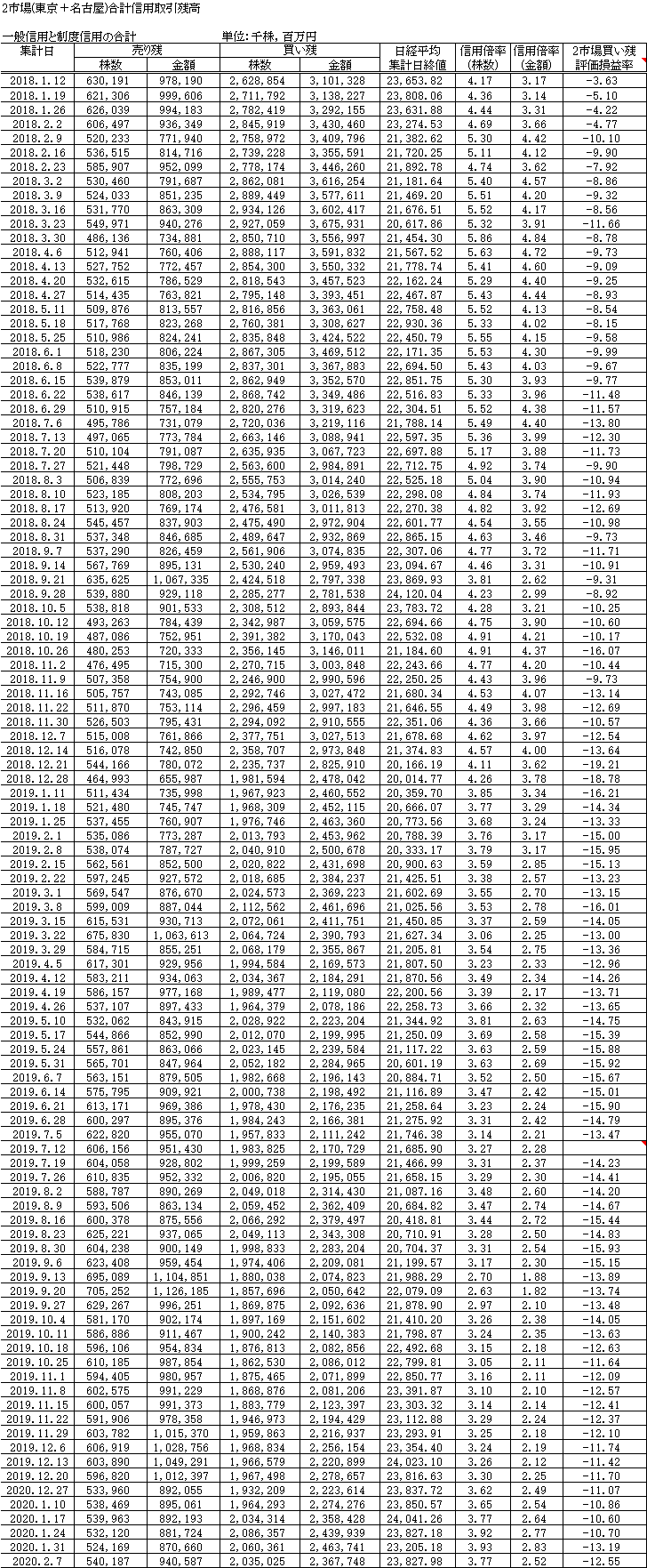 で、2/7現在の信用取引残高のグラフです。売り残が増えて買い残は減少、信用評価損益率はよくなっています。