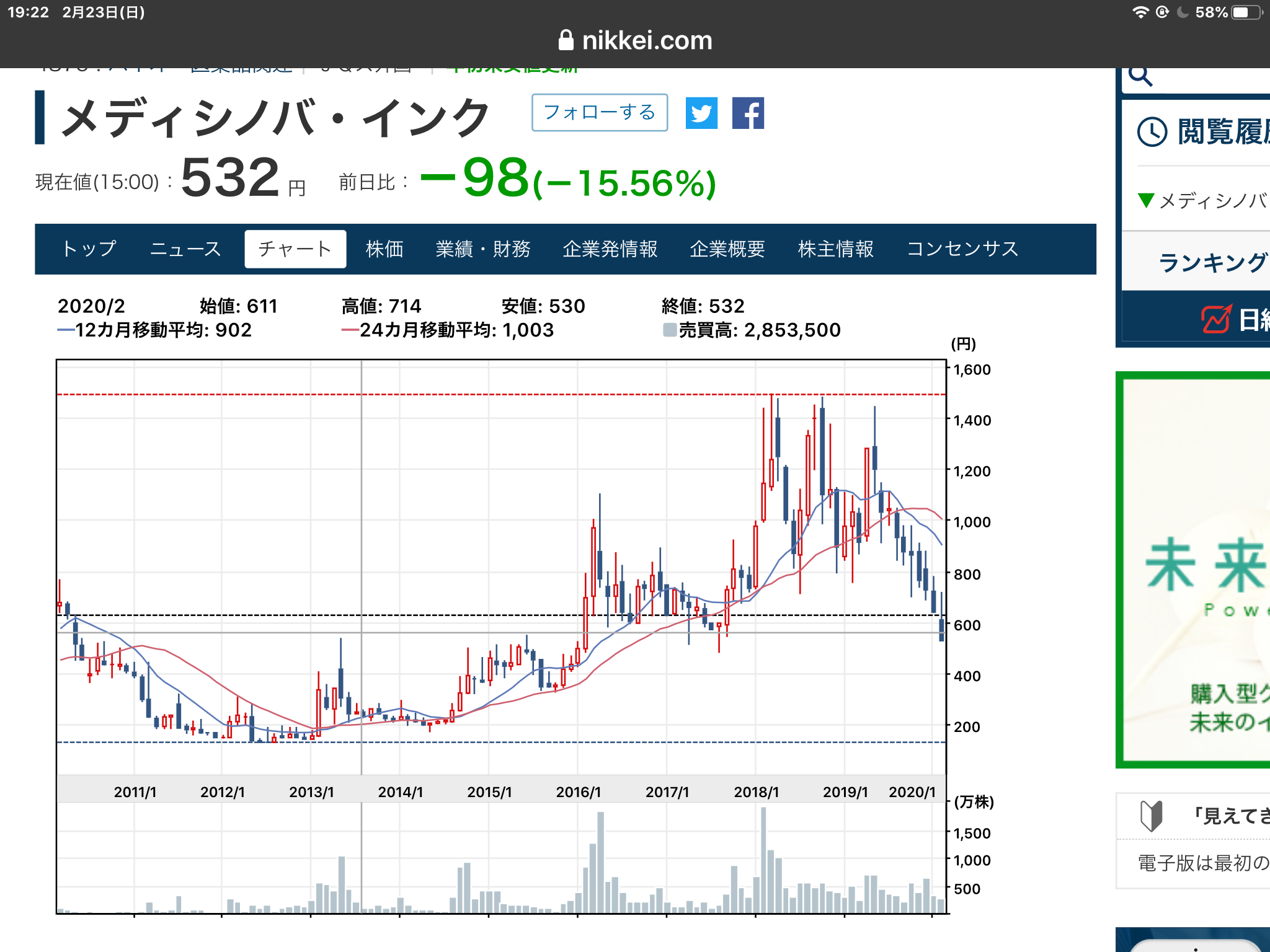 まぁグリーはゲーム銘柄だからバイオ銘柄には当てはまらないかも知れないけど半値8掛け2割引の投資格言をメディシノバインクに当てはめると480円前後の大底迄は想定されてた方が良いかもです。
