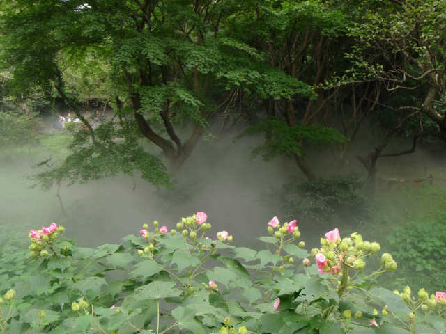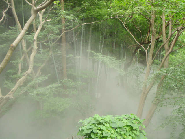 写真1と写真2は、横浜トリエンナーレの三渓園会場に出展された 中谷 芙二子《雨月物語 - 懸崖の滝Fogfalls#47670》