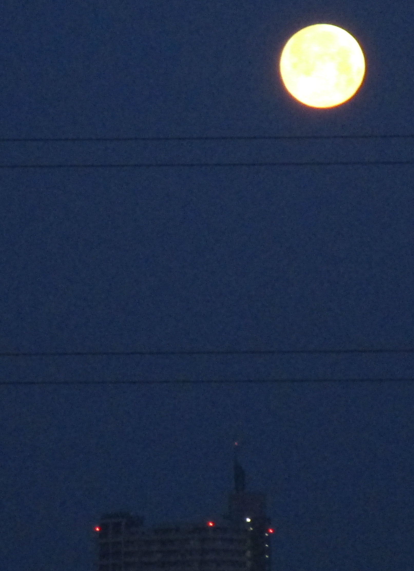 夜明けちょい前。うちから見える高層ビルに重なるかどうかは