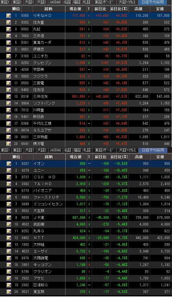 日経平均は続落。TOPIXは小幅反発。昼頃は高かったのですが、午後2時過ぎから売られました。追証売りとか遅れて売ってくる人とかがいるので戻りが抑えられます。売らなければいけない人が売りきってしまえば、あとは反発しそうです。今日は、景気敏感株に大きく上昇する銘柄が多かったです。朝方発表された機械受注は悪い数字でしたが、ここまでの下げで織り込みだったのか機械株でも上昇する銘柄が多くありました。東証一部出来高は29億株、売買代金は2.5兆円。