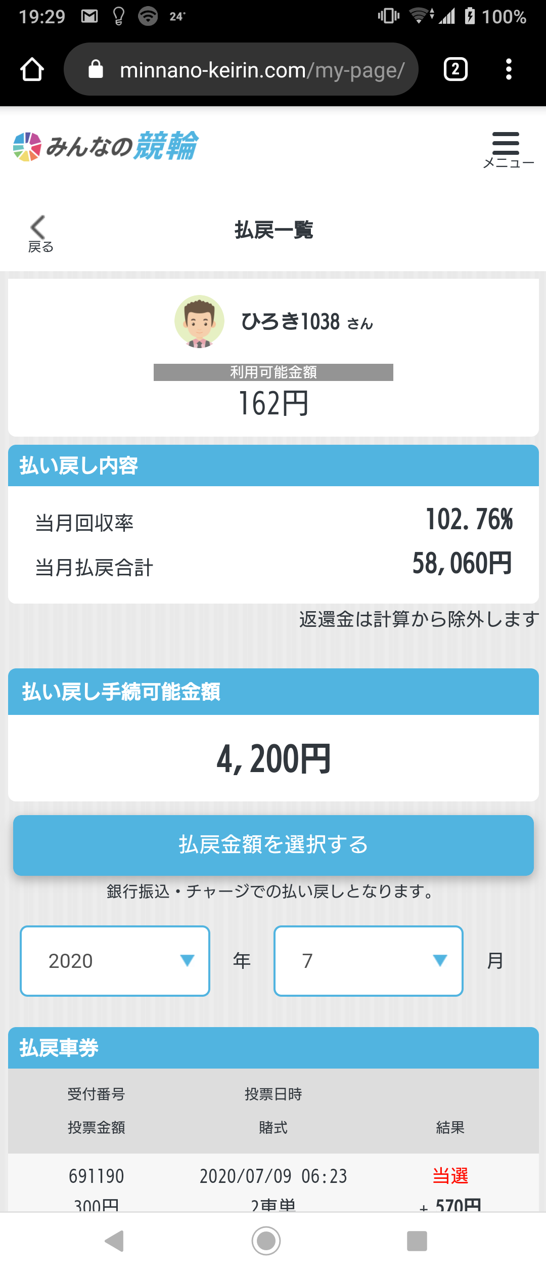 賭けた時点で25%の利用手数料を引かれるので、回収率75%でトントンなのですが、回収率102%はかなり善戦していると思います。