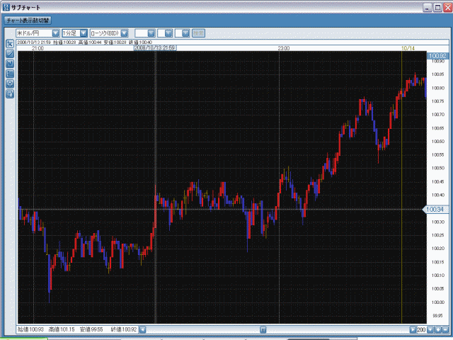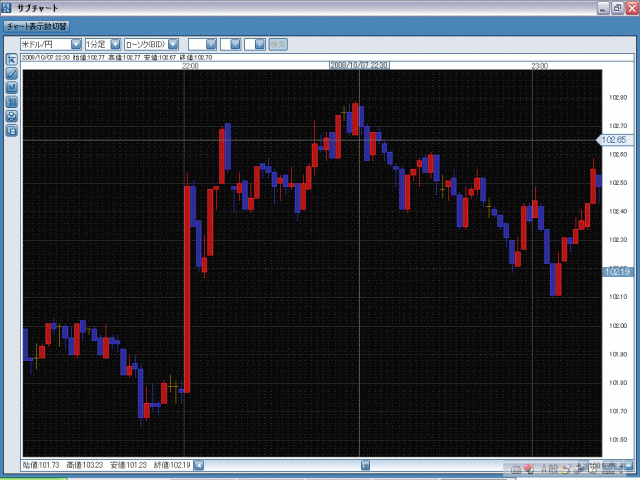 例えば、10/7の21:59からの1分でドル/円は70銭ほど円安方向に進んでいます。