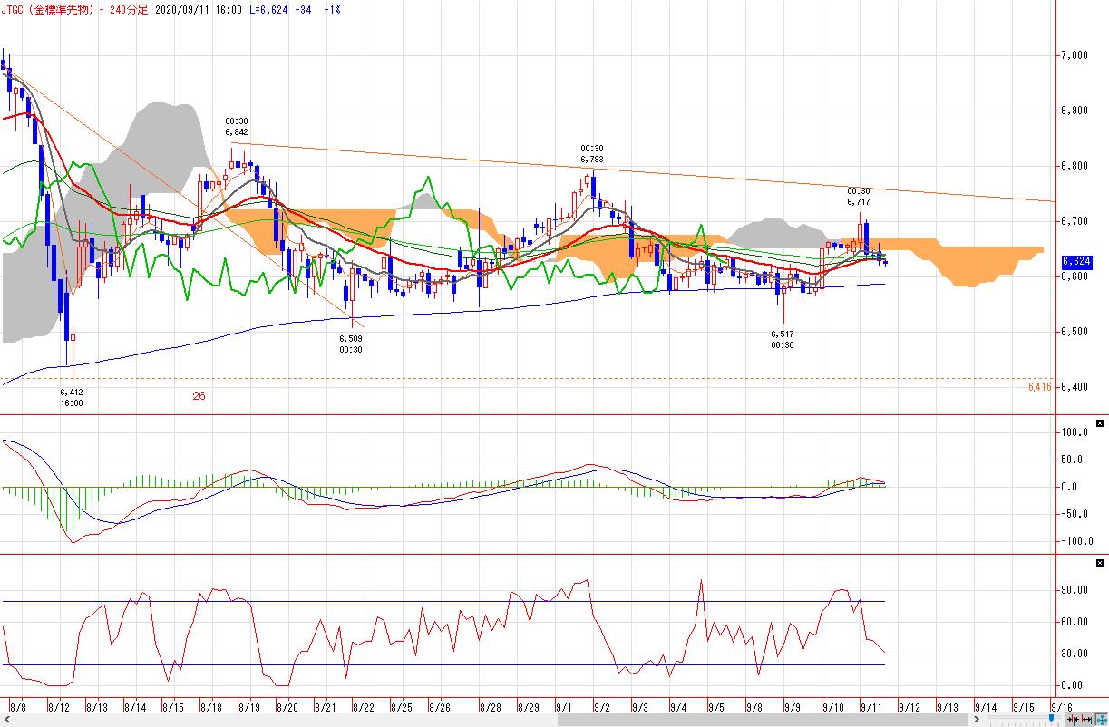 金先物は前日比35円安の6623円近辺で推移しています。