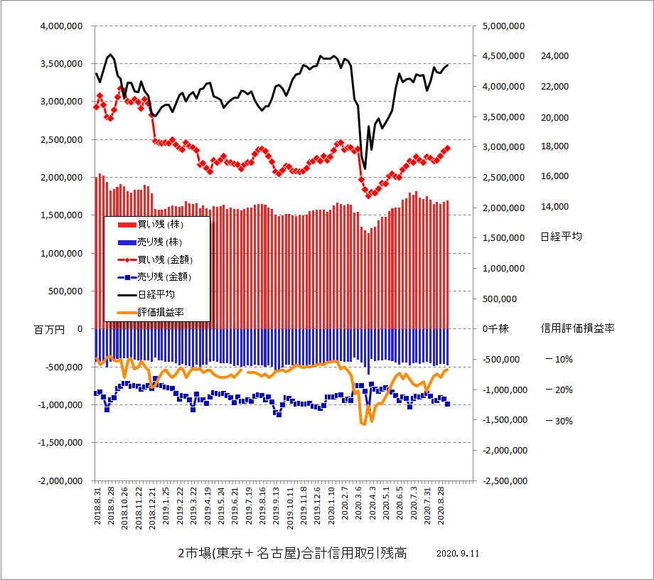で、9/11現在の信用取引残高のグラフです。売り残も買い残も増加しています。信用評価損益率はコロナ前にほぼもどったかなというところ。