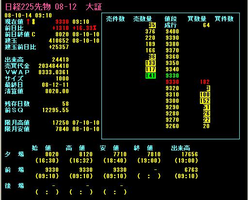 日経は+1171.14(+14.15%)大暴騰。またもや、記録的な値幅(今度は上昇)となった。日経プロファイルによると、上昇率1位。