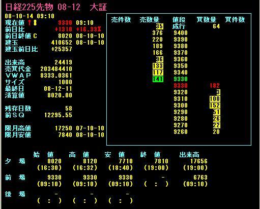 下落時とは全く反対で、売る人がいない状態。今日も、先物はもっと上に行きたいが、現物がS高で付いていけない状況に見える(サヤは150円ほどついていた)。クラッシュ的な売りからの反動で、2,3日上値は軽くスイスイ行きそうである。が、昨日までの下落が実体経済に与える影響は避けられそうもなく、いざ戻り待ちに会ったときは、上値は重く、二番底形成の流れになりそうだ。