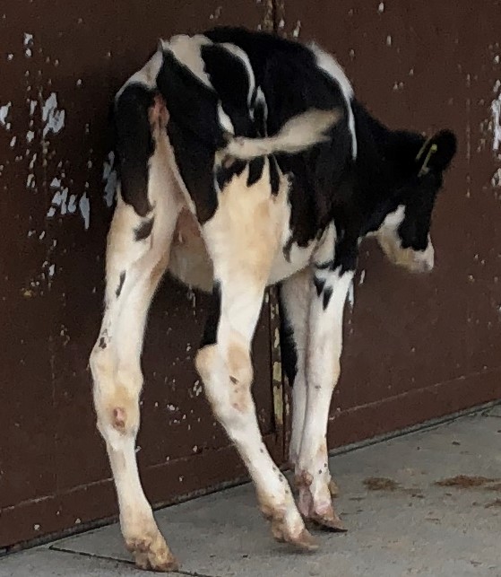 子牛にアブが寄ってきて、いやいやして尻尾を当ててるけど、