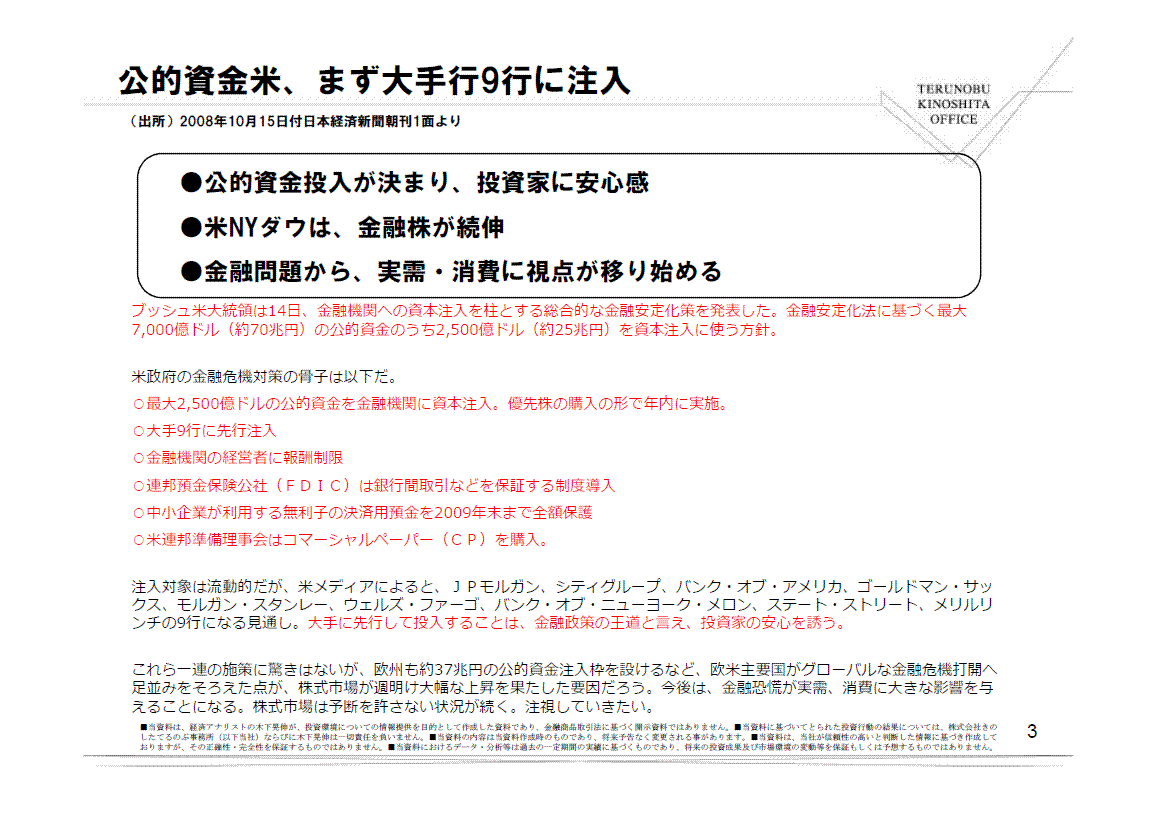 米国が大手金融機関に公的資金を使って資本注入することを決めるなど