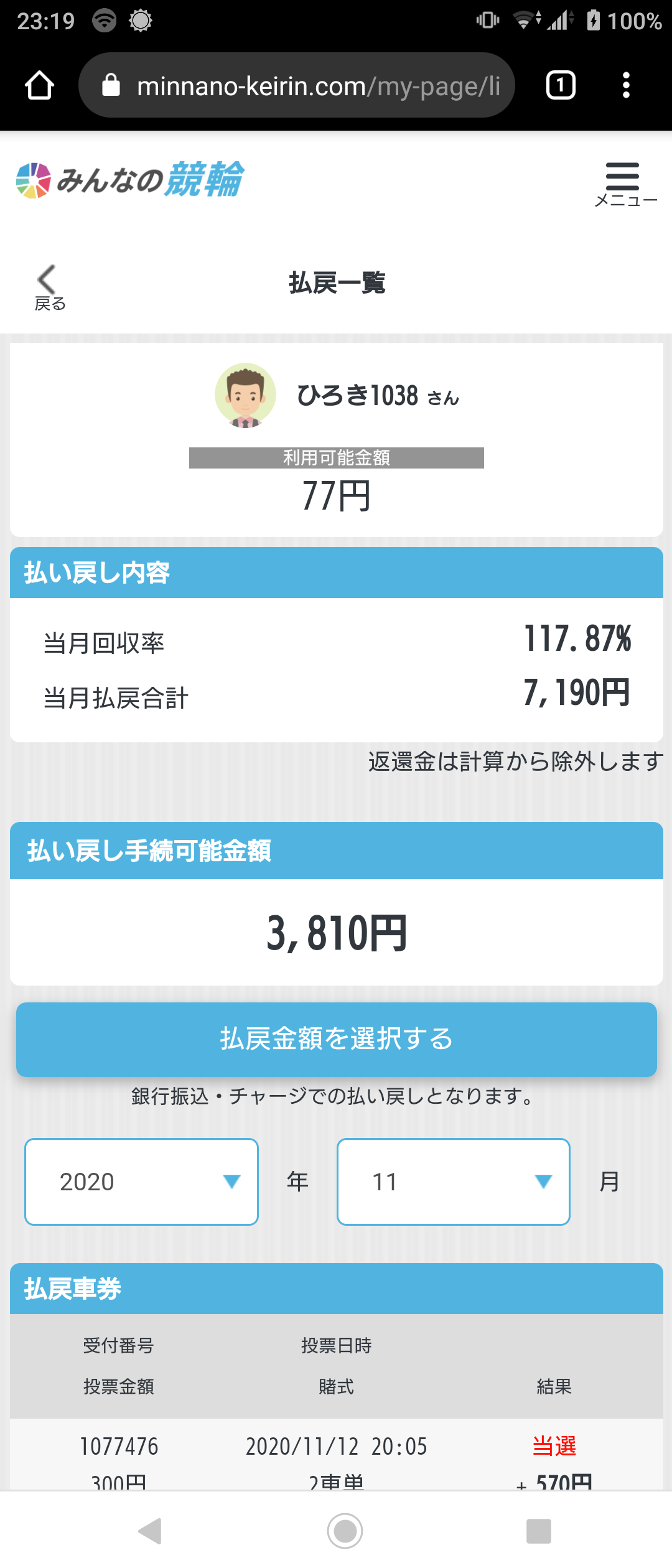 11月の私の競輪回収率は117%で、わずかですが勝ってます。