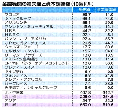 世界の大手金融機関約100社における、サブプライムローン問題が表面化した2007年7月から今月16日までの評価損を含めた損失額が総額6600億ドル(約67兆200億円)に上ることがわかった。一方で、そうした損失への対処に総額6196億ドルの資金が調達されている。