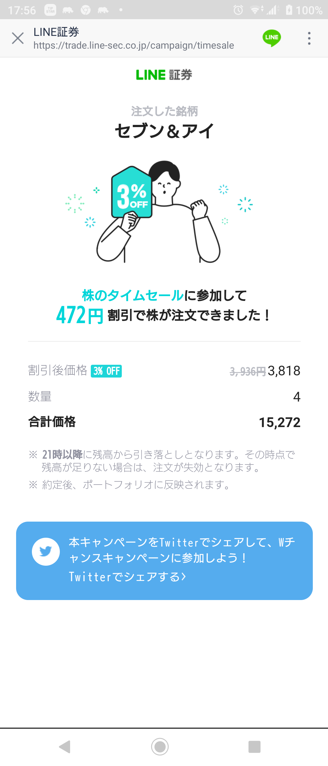 そしてLINE証券と言うところで、今日5銘柄が3%オフで買えました。