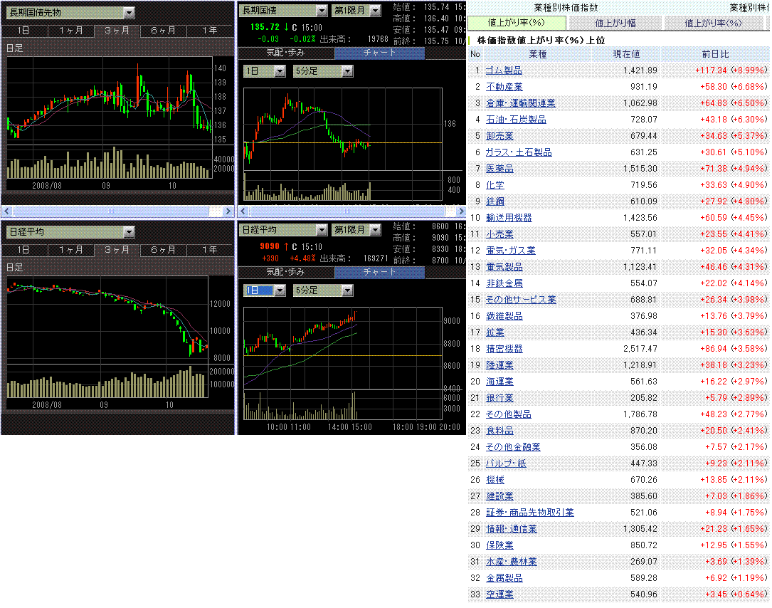 GLOBEX米株価指数先物高と円高進行を受けて日経平均は続伸しました。先物の買いが強かったです。個別銘柄は、ゴム、不動産が強かったです。商社、鉄鋼、非鉄、自動車などもそれなりに上がり、電力や医薬品も買われました。景気敏感株もディフェンシブも買われて、資源関連株も資源安メリット株も買われて、物色傾向がよくわからない相場でした。機関投資家が株式全体のウェイトを戻してきているのでしょうか。