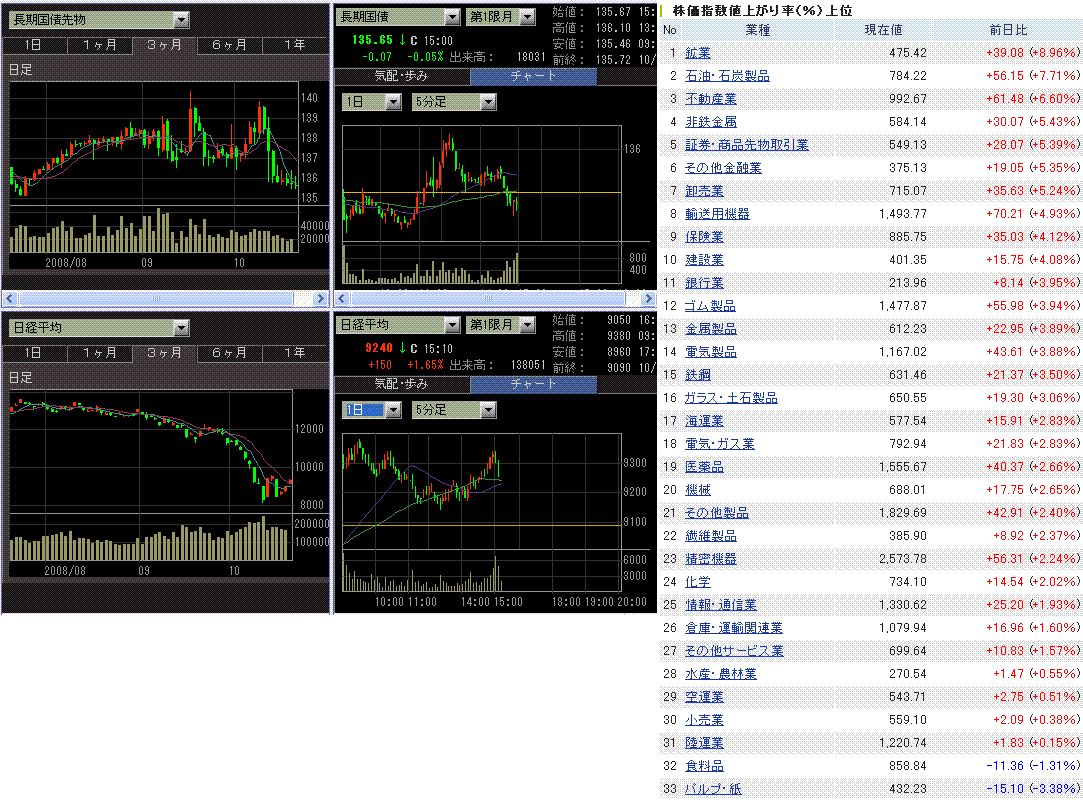 業種別では、資源高を受けて、鉱業、商社、非鉄など資源関連が高かったです。それと、信用不安が少し和らいできたことから、不動産、銀行、証券も買われました。メラミン騒ぎのサイゼリヤはストップ安。