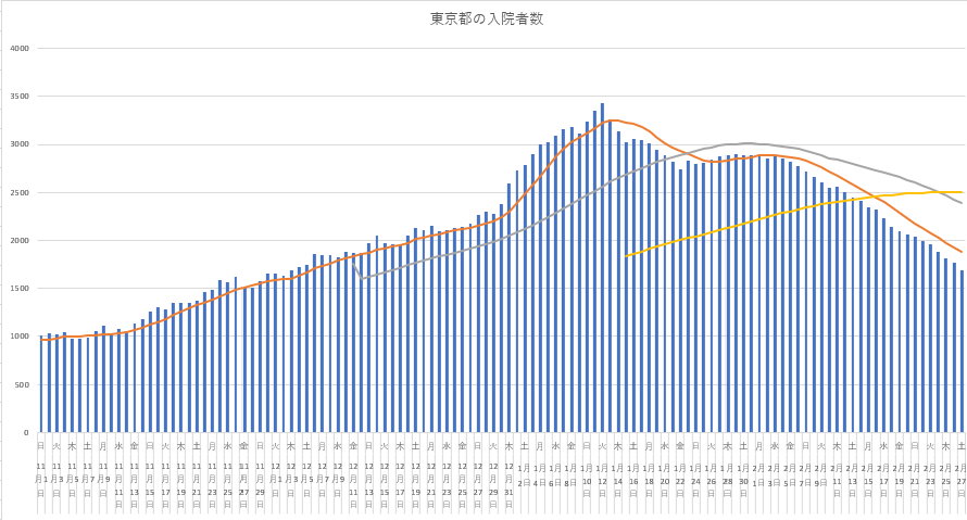 その代わりに、新規感染の図に加えて、東京都の入院者数の図を追加しようと思います。