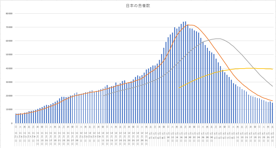 ついでに、日本の患者数合計も図にできますが、こちらは入院以外も含む治療中の総数なので単純比較はできません。それと、入院数や患者数は新規と異なり、各日の現在値なので、こういうグラフでよいのかどうか、という疑問は残りますが、傾向は分りますね。