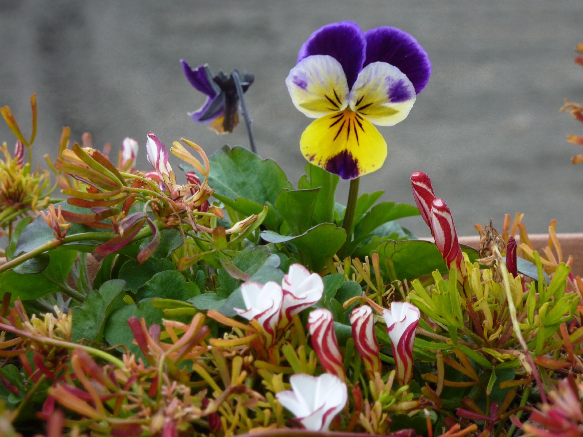 「オキザリス」群の中に咲く「ビオラ」と