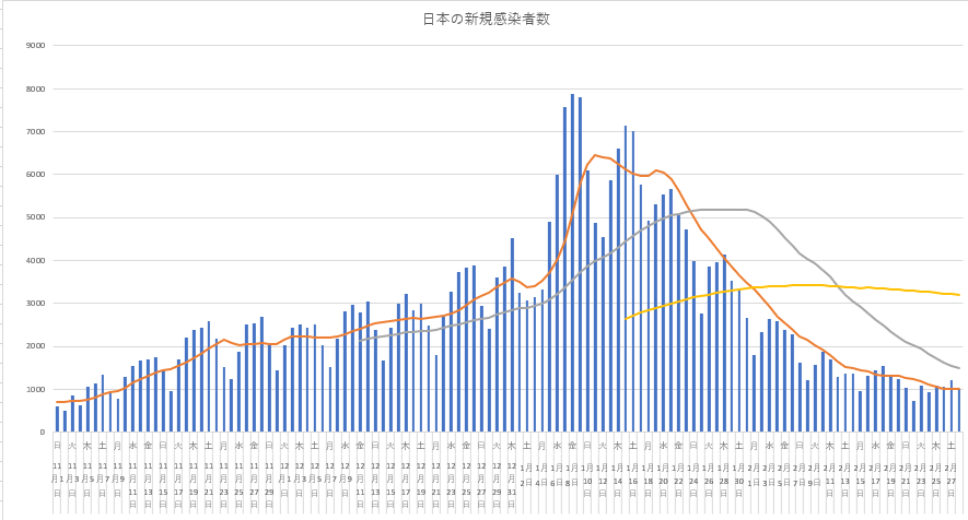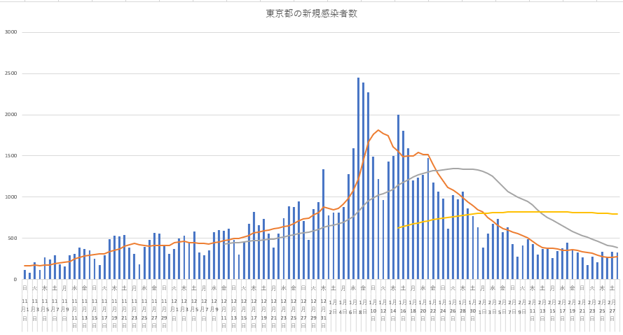 すでに3月1日ですが、今日から感染データはグラフだけにします。一度に載せると分りにくいので、まずは東京都の新規感染を載せ、残りはコメントでひとつずつ載せることにします。