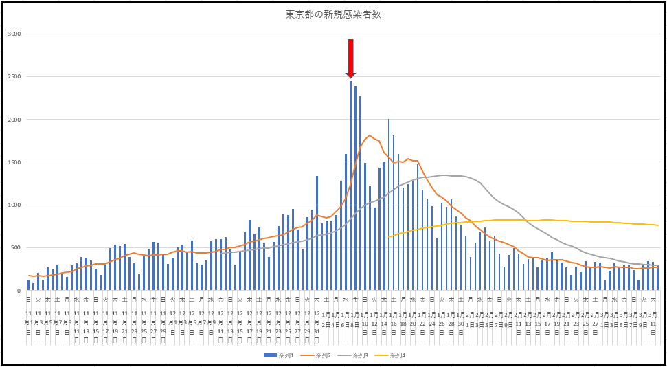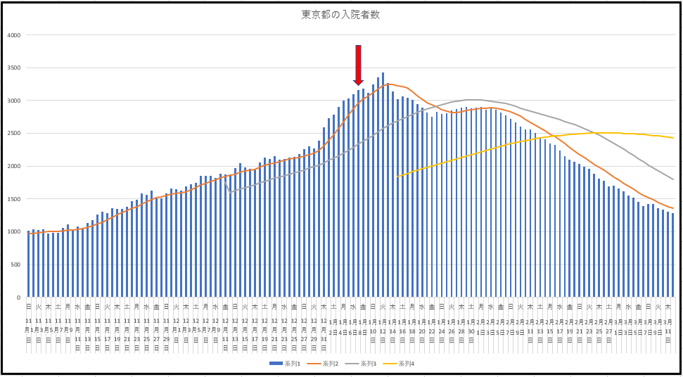東京都の新規感染と入院者数の推移。新規感染は昨年の11月初旬レベル。入院者数は鋭意減速中だが、そのレベルにはもうあとちょっと。