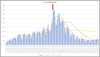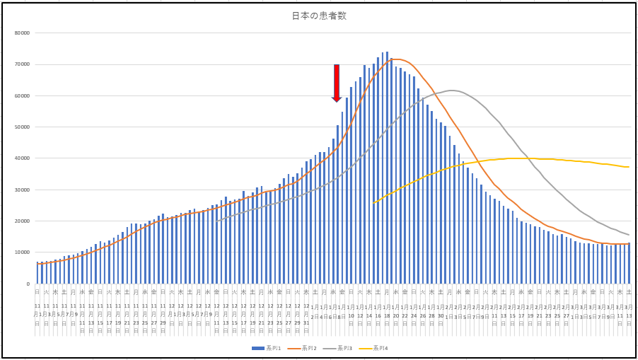 東京の新規感染と入院患者数の推移。東京のデータは毎日朝の9時に締め切って諸々を集計し午後3時に発表される。つまり今日発表のデータは実質昨日の実績なのだ。今日のだけ見ると完全にゴールデンクロスで上昇に転じる風だが、本来少ないはずの日月がどうなるか、ですね。