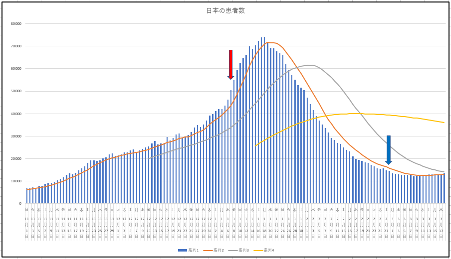 日本の新規感染と治療もしくは観察中の患者数の推移。こちらは2月末に大阪などの宣言解除があったのでその日を青の矢印で指している。