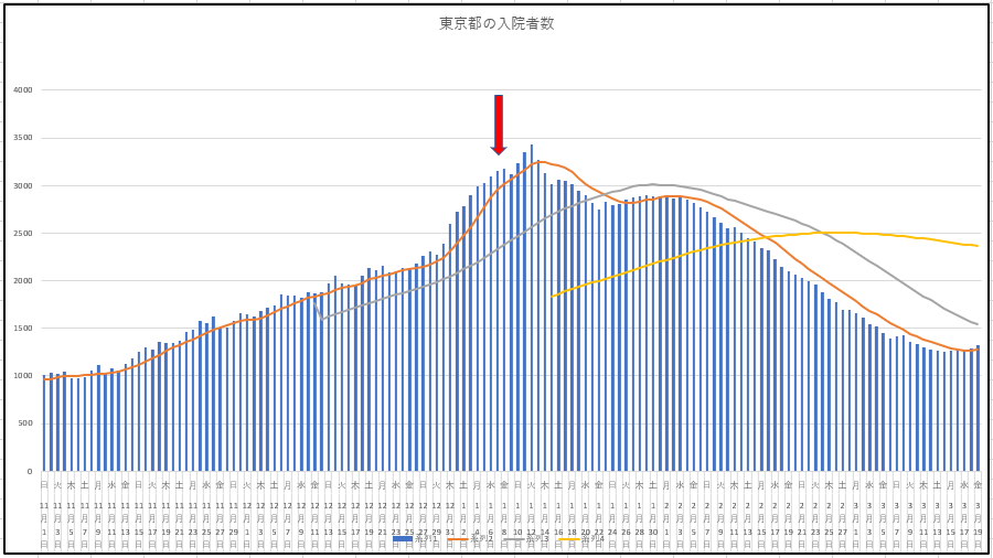 まず東京の新規感染。左端の昨年11月初旬と比べて十分低いといえないが、ここ2日ほど前週の同曜日を下回った。つまり7日移動平均は下降。これを上昇という報道があったのでよく見ると、1週間前の7日移動平均値と比べたら上、ということだそうだが、たしかにそうだ。どちらにしても微動ですが(^^);