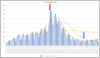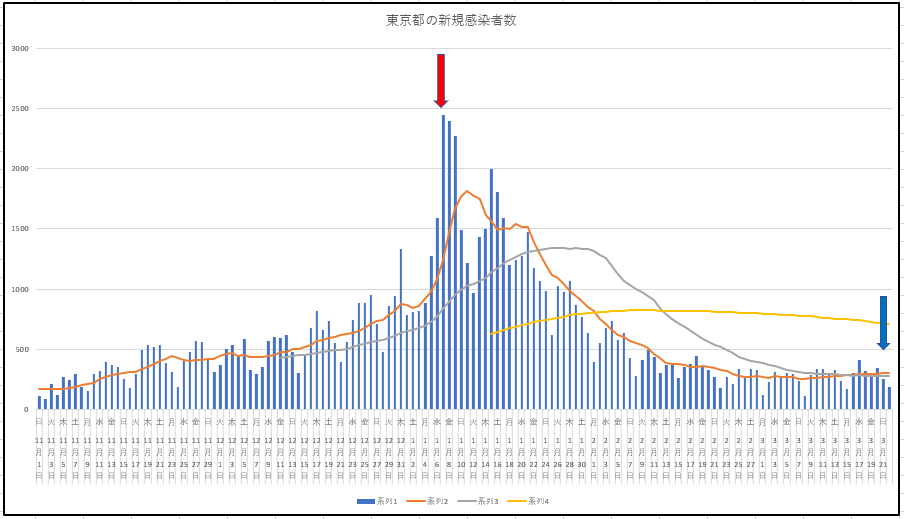 東京都の新規感染と入院患者数。青い矢印がまさに解除の位置。月曜に新規が少ないのは普通ですが、平均線の動きは微妙ですね。それに入院患者って微増している風。