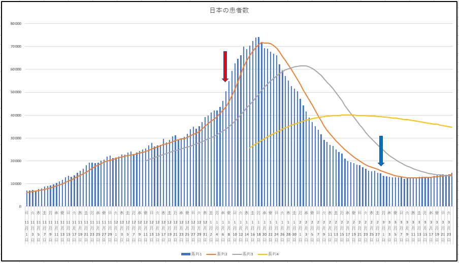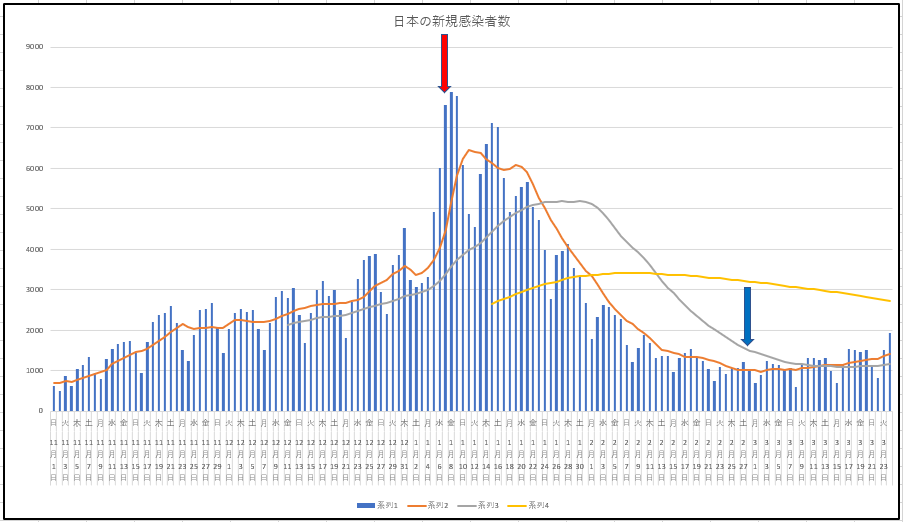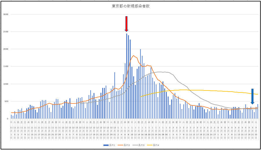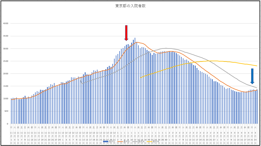 まず東京の新規感染と入院患者数推移。やはり週中に向けて上昇する。このあと貼り付ける日本のデータもだけど、青い矢印(緊急事態宣言解除の日)の後がどうなっていくか。
