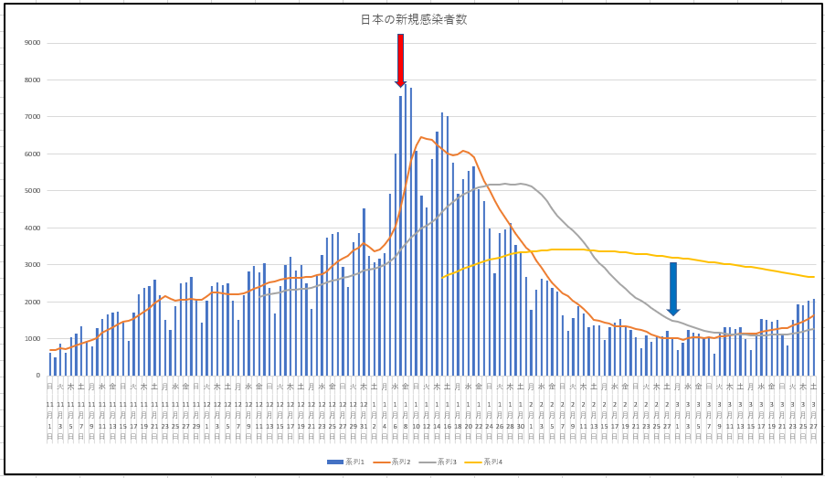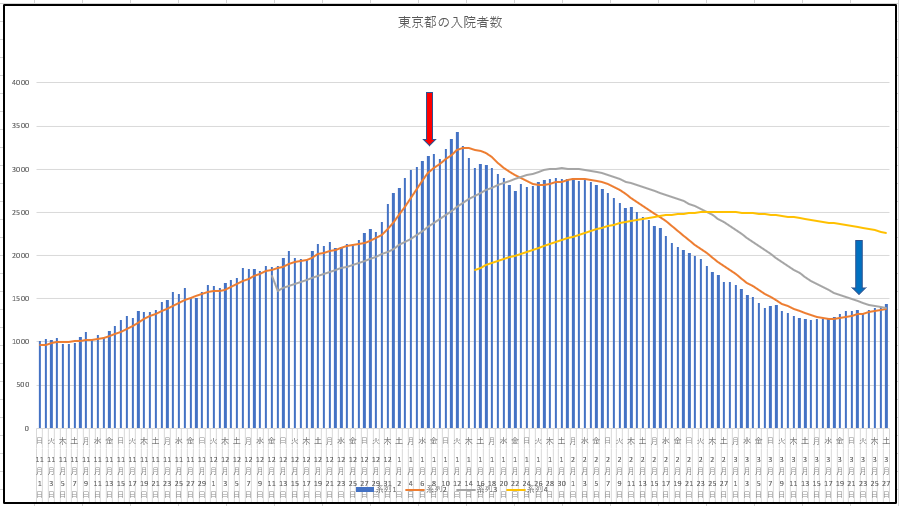 次に東京都の入院患者数の推移と日本の患者数の推移。ここに載せているデータの中では遅れていたのですが、東京都の7日移動平均が28日移動平均をとうとうゴールデンクロスしました。このトレンドは強く、傾向は続く見通しです。対策は大丈夫でしょうか?