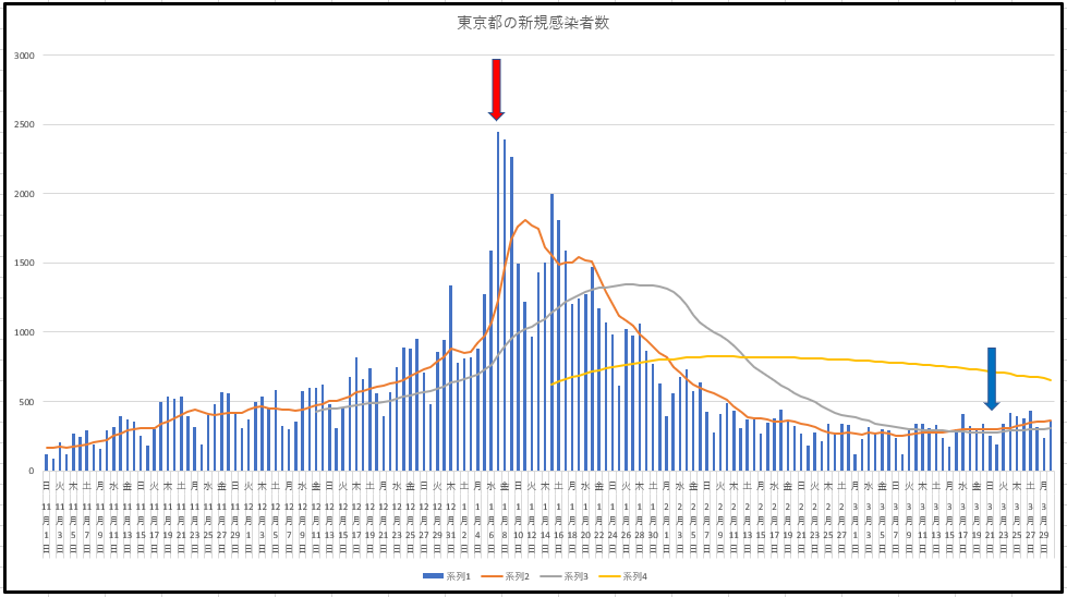 というわけで今朝は、まず昨日の東京都と日本の新規感染の推移を添付して、コメにてそれぞれの入院および患者数の推移を添付します。木金にかけてさらに上昇が顕著になるでしょうね。宣言はいいから飛沫感染に注意しましょう。