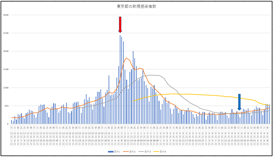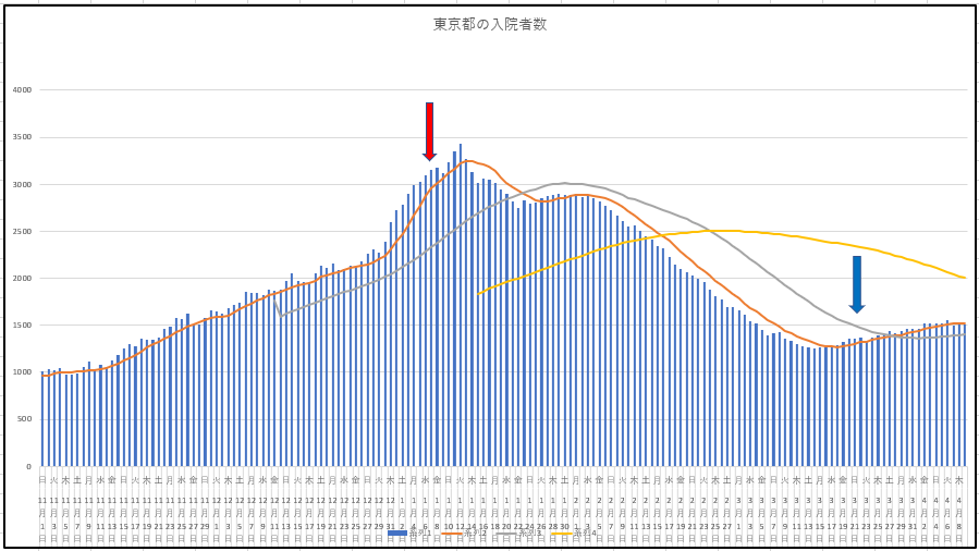 まずは東京の新規と入院患者数の推移。地元が「まん延防止」の対象に。まぁ、都心から離れているためか、一部の人々の行動は緩くなっており、大げさに言えば、老人は昼カラ、中年オヤジたちは、吞んだり騒いだりを止められず、若い人は朝までよいつぶれて駅前にたむろし、てな風ですよん。こりゃいかんですね。