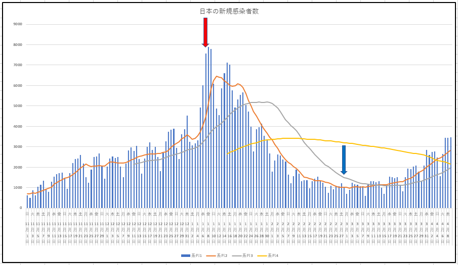 9日(金) までの日本の新規と患者数の推移。引き続き大阪の新規は日本全国の4分の1以上。なお、患者数はとうとう84日移動平均の上に出るようになってしまった。これは累積ではなくて現在なお治療中および観察中の患者数の推移なので要注意であります。変異株患者は分けないといけないし、入院は長くなっているようです。新規が頭打ちになってもしばらくはたいへん。