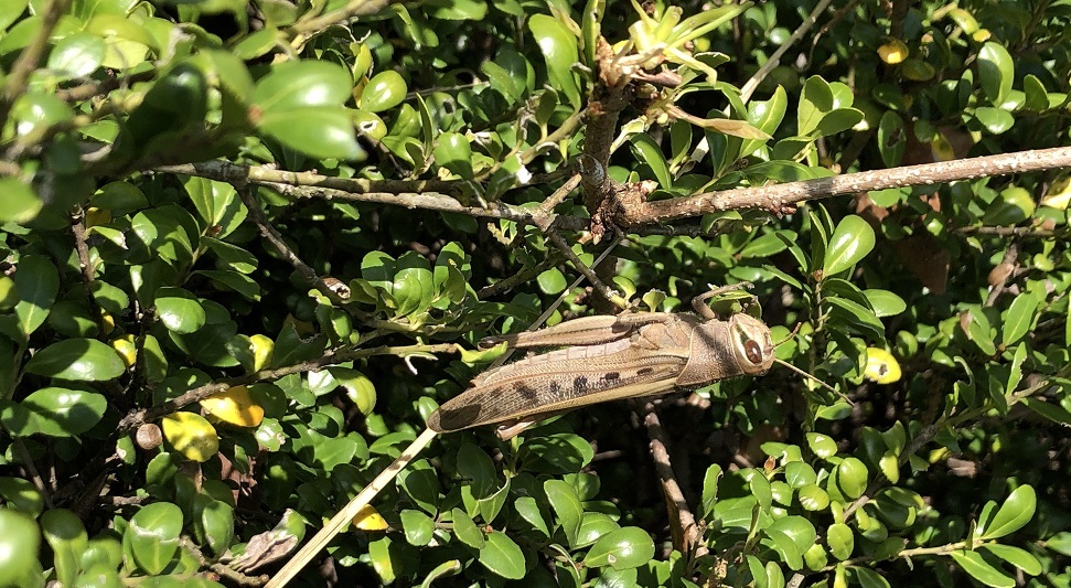 成虫の体長はオスが5cm、メスが6cmほど。体型や大きさはトノサマバッタやクルマバッタに似ているが、全身が褐色で、細かい毛が生えている。背中には黄白色の線が頭部から尾部まで走っていて、複眼の下に黒い線、胸部の側面にも黒い縦しまがある。