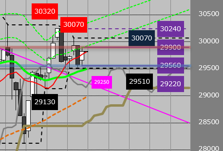 トレンドは継続すると考えるので、本日の想定レンジは孕み足レンジ[29900~29560]。