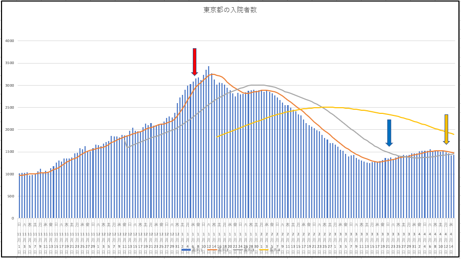 東京都の今日までの新規と入院患者数の推移。魔の木曜なのでそれなりだったが、トレンドはまだ持ちこたえている。今週末が山か?