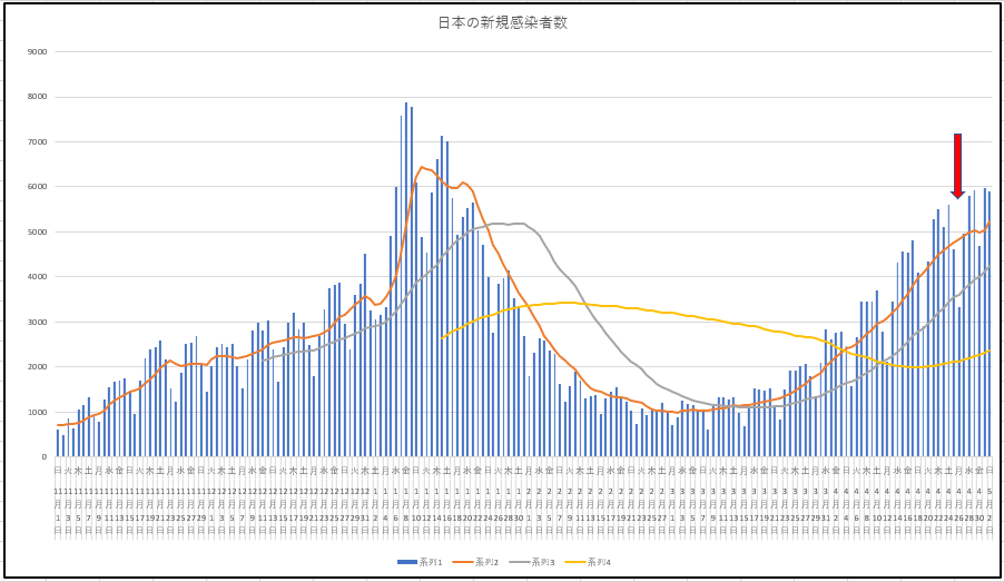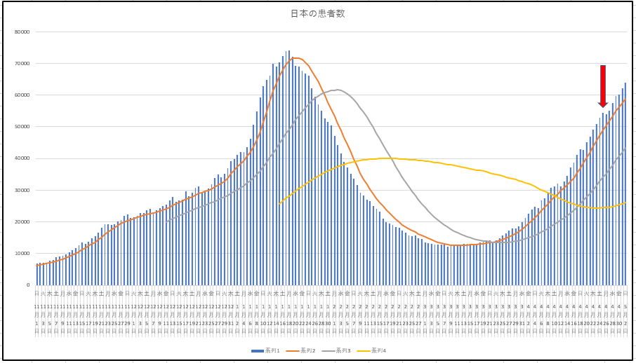5月2日までの日本の新規感染と患者数の推移グラフ。新規感染の伸びのあとに少し遅れて患者数が増加しますね。