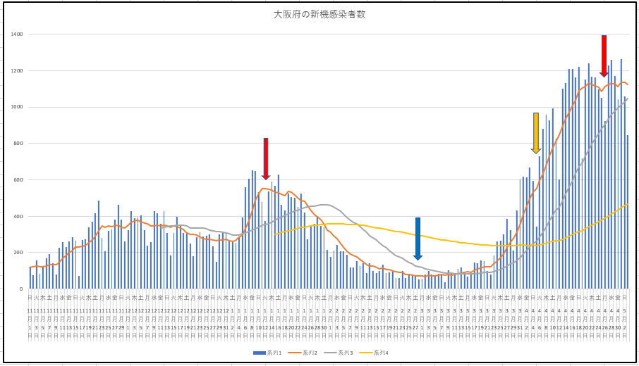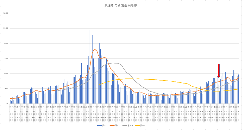 東京都と大阪府の新規感染者数の推移。目ん玉飛び出る(@@)ようなびっくりにはならなくなりましたね。