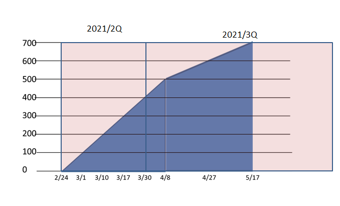 5/14に700万DL達成!さすがにリリースから+100万DLが10日前後で達成されてことを考えると最近は+100万DLに20日程度とDL数の伸びは鈍化しています。日本国内でスマホゲームを行う人口を考えるとかなりの数で比率もかなり高いと思います。(いまだに無料アプリランキングで10位前後、売り上げランキングでほぼ1位を取り続けています。)これ以上の伸びについてはプラトー、頭打ちが近いのかな?と思います。韓国語や中国語での展開をしたとしても、競馬という文化、素地の違いがどうなるのか?不透明です。ちょっとネガティブな書き方をしました。しかし、そんな状態ですが、既報の3月を振り返るために、ダウンロード数を資料としてみますと、2/24リリース開始、3/1-100万、3/10-200万、3/17-300万、3/30-400万、4/8-500万、4/27-600万、5/17-700万。4~6月(2021FY3Q)の売り上げについては、この右肩上がりのユーザーからの売上が期待されます。無料の範囲だけで遊ぶ方も大勢いらっしゃるでしょうが、ユーザー数が多いほど売上総数も期待できると思います。グラフにしましたが、DLした方が一様に課金するとは考えにくいものの、通常のアプリとは広がり方=浸透の仕方が異なるため、「売れすぎ」となり、おそらく前回上方修正した年間目標を3Qで超えると思います。具体的な数字は以前予測してみましたので、もう改めてしませんが、今から6月27日の3Q発表とその後の市場の反応が楽しみです。よく比較されるアプリとして長期的に良好な売上を見せるモンストやパズドラ。システムが古いと言われながら熱心なファンのいるFGO、その他には荒野行動やプロスピ、ウイイレ、どれも”ちょっかいを出すレベル”で「敵ではない」。他のソシャゲ開発メーカーも今のところCygamesに脱帽状態。サイバーエージェント側の「長期的なIP」という目標は、よりライトな課金でアクティブユーザーを減少させない、加熱しすぎないゲーム仕様/設定とを目指すということなのだろう。どのようなゲームもしくはIPになっていくのか見守りたい。