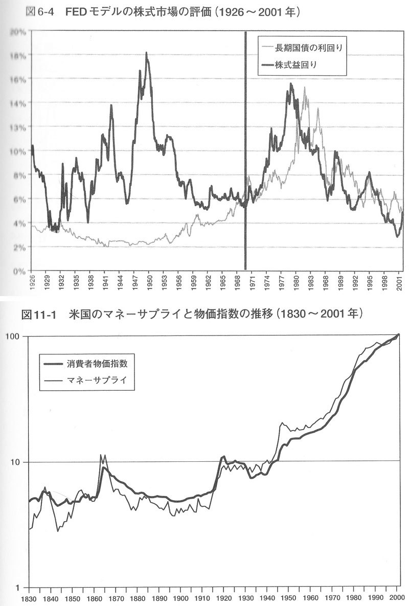 上は株式益回り(PERの逆数)と長期国債利回りの推移。1970年代以降は、相関性が高い。1970年頃に起こったことは、金本位制の完全廃止とインフレの加速。今後も株式益回りと長期国債利回りの強い相関は続くのだろうか?だとすると、現在の低金利状態は高いPER(低い株式益回り)を許容し、PERが低いレンジに戻ることはないのだろうか?