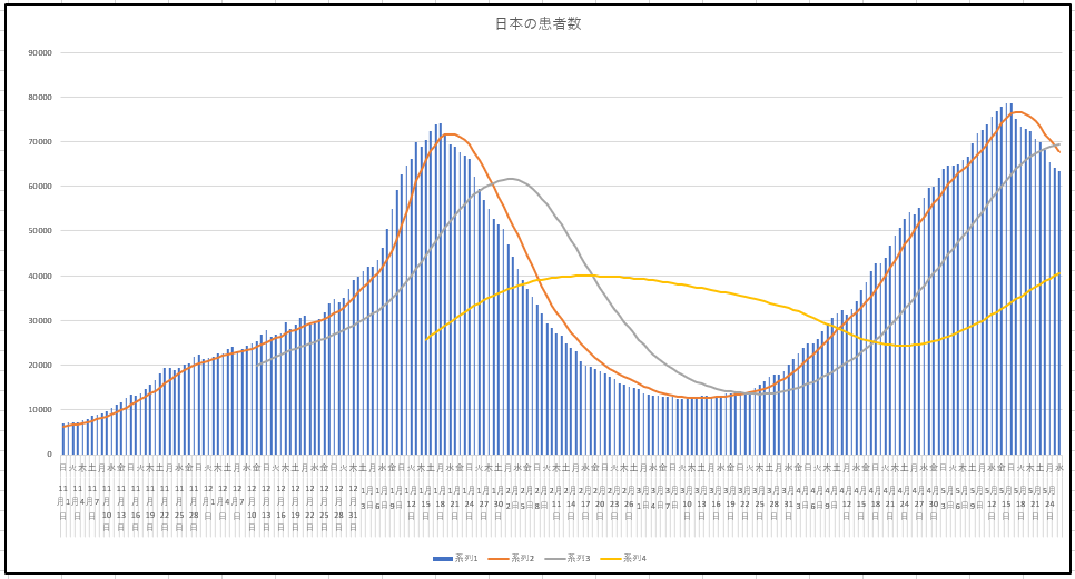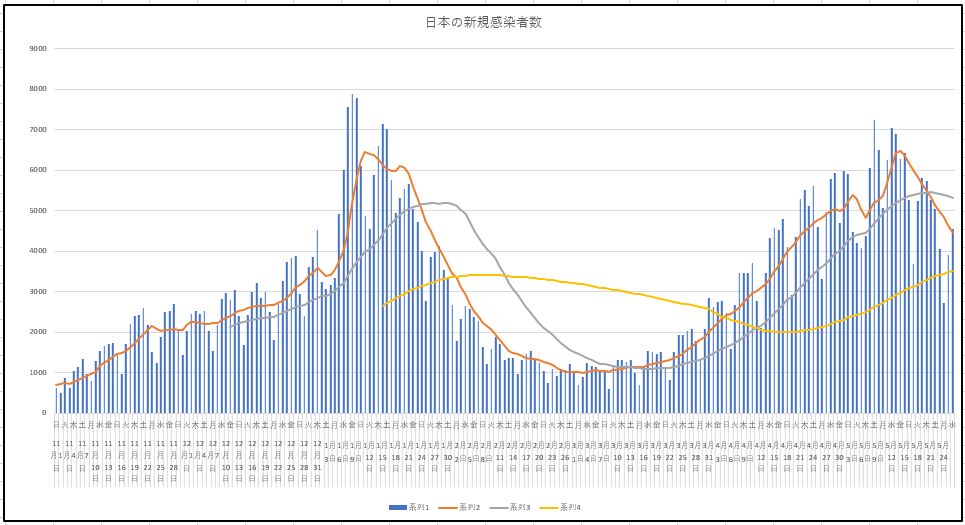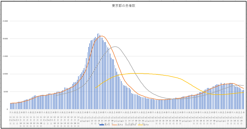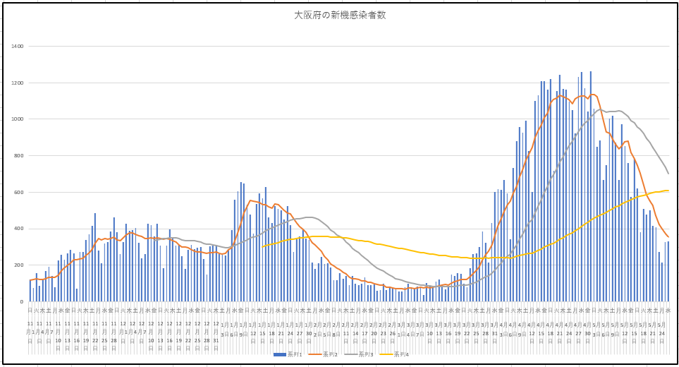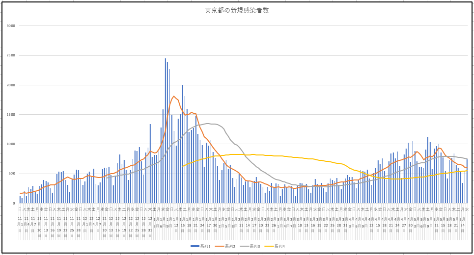 5月26日(水)までの東京都、大阪府、日本全国の新規の推移。