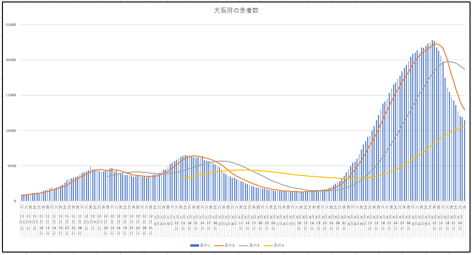 26日までの、東京都、大阪府、日本全国の治療中や待機中を含む現在の患者数の推移。