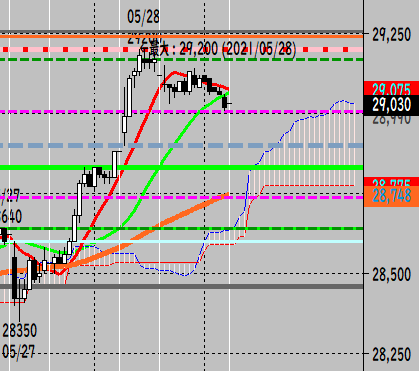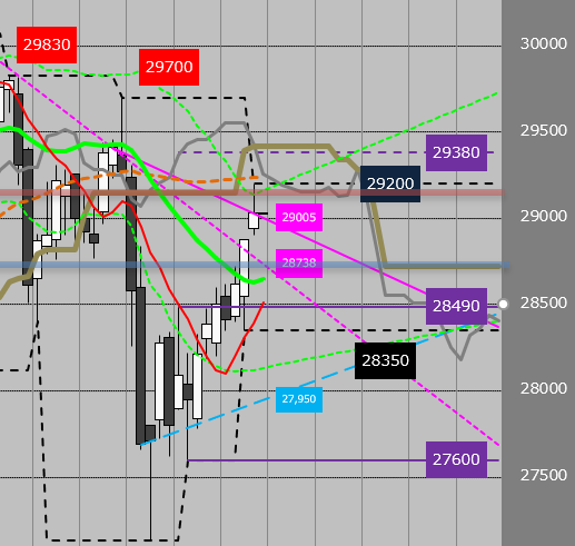 日足は300円のギャップアップ+長い上ヒゲを出したので一旦戻り高値を付けたと考え、下値を試す展開を想定(→287**)