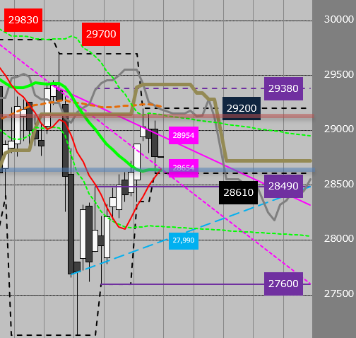 ナイトセッションでは四回28830(週足25MA)で売られているので、一旦は28610を試す展開か
