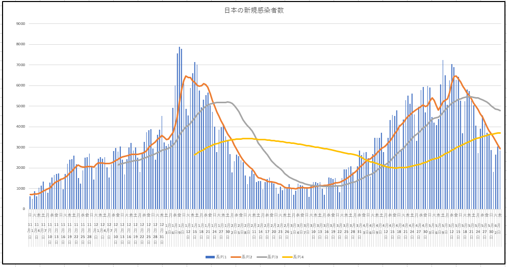6月3日(木)までの全国の新規感染者数と現存する患者数の推移。減少傾向は顕著だが、1月のピークのあとに下がった鍋底のところ、3月中頃の水準まであとちょっと。