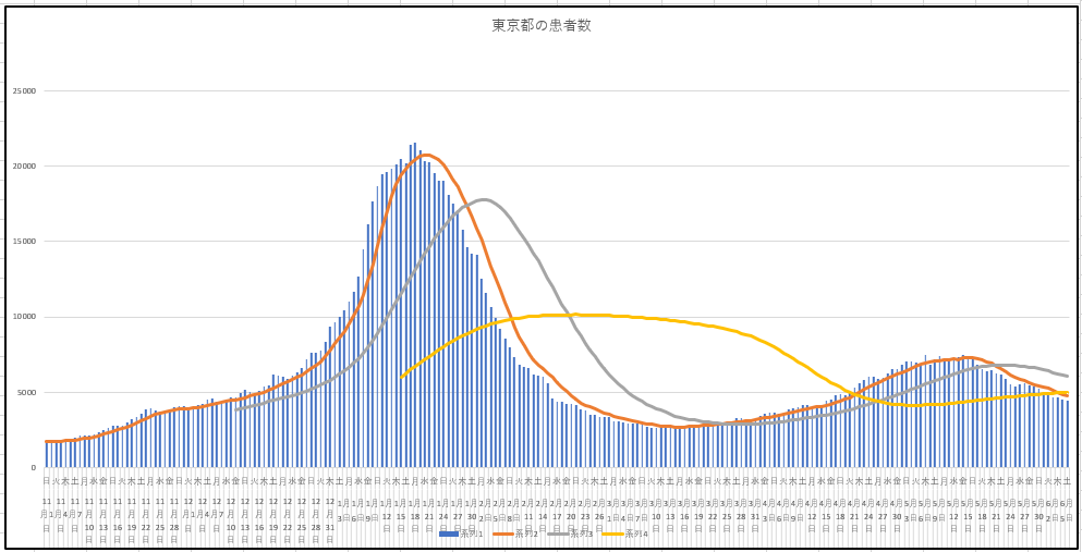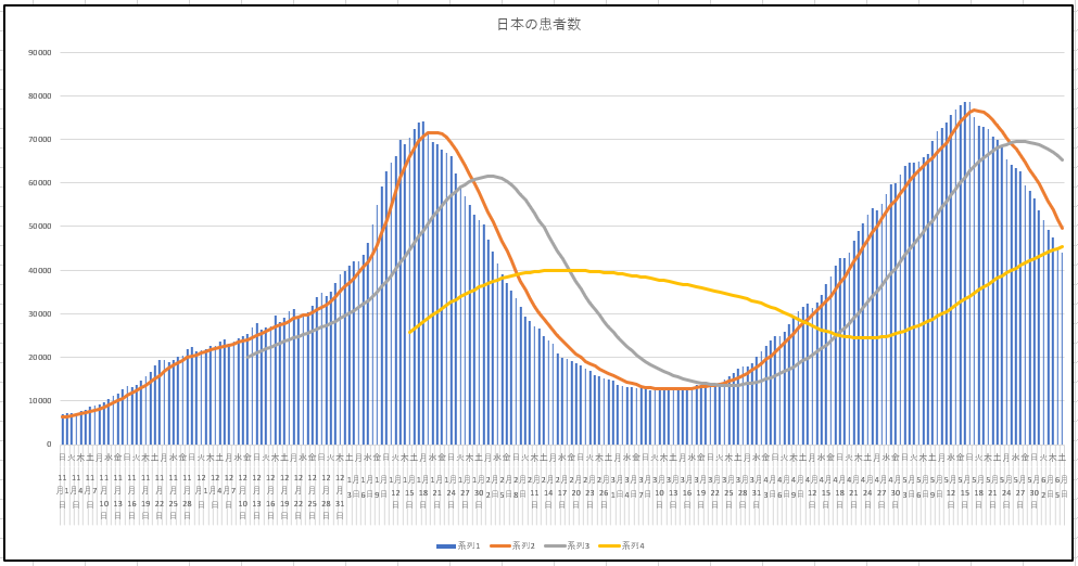 同じく5日(土)までの日本の新規と現存患者数の推移。